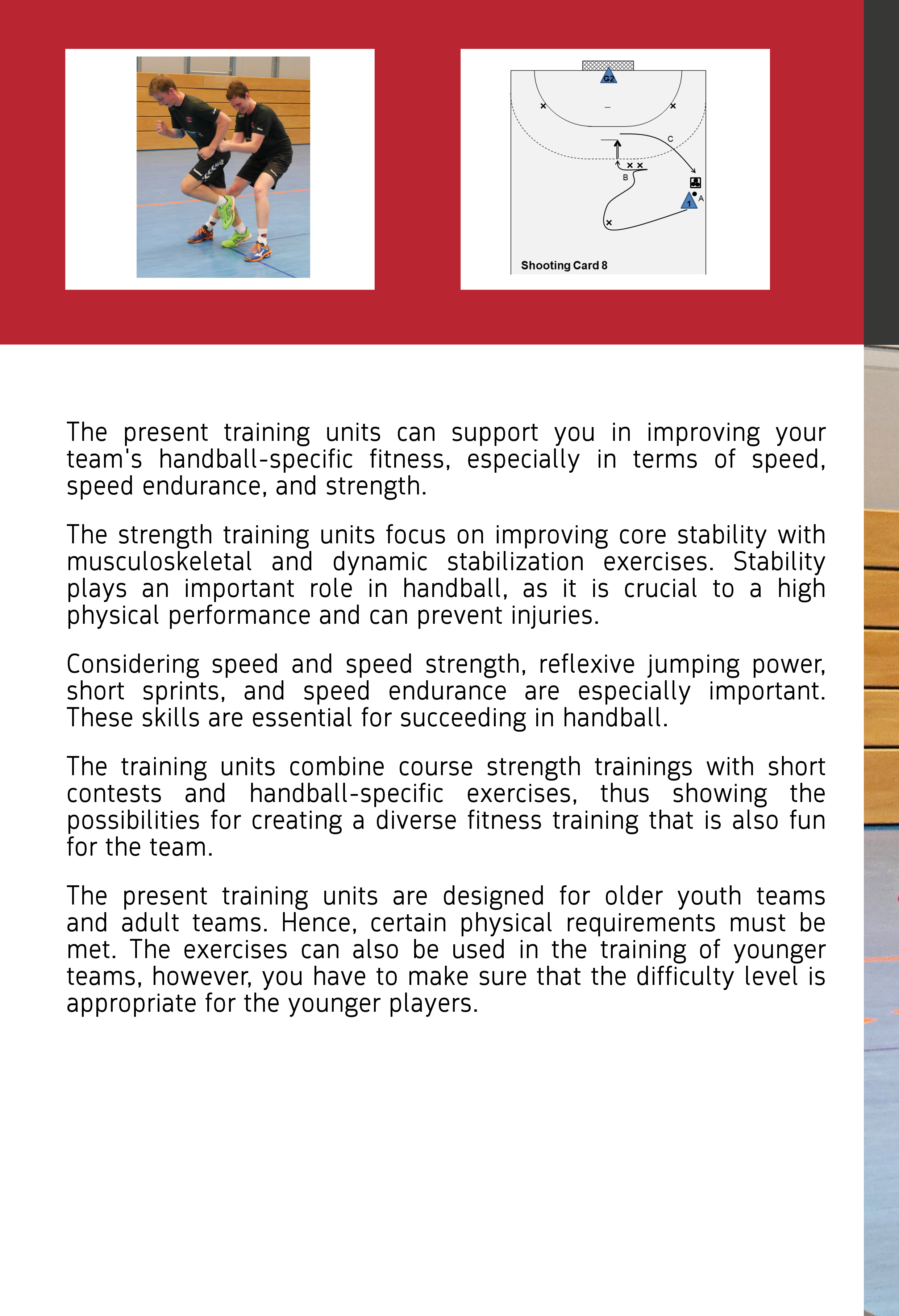 The training units combine course strength trainings with short contests and handball-specific exercises, thus showing the possibilities for creating a diverse fitness training that is also fun for the team.