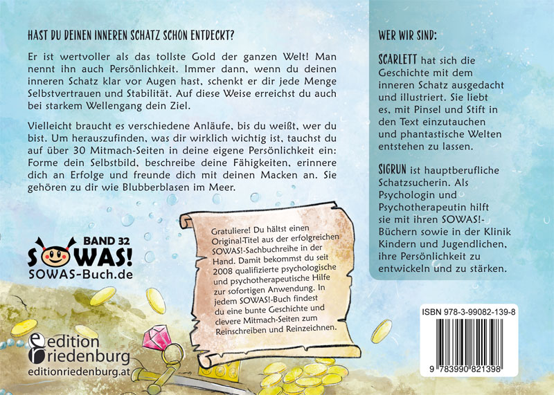 Hast du deinen inneren Schatz schon entdeckt? Er ist wertvoller als das tollste Gold der ganzen Welt! Man nennt ihn auch Persönlichkeit. Immer dann, wenn du deinen inneren Schatz klar vor Augen hast, schenkt er dir jede Menge Selbstvertrauen und Stabilität. Auf diese Weise erreichst du auch bei starkem Wellengang dein Ziel. Vielleicht braucht es verschiedene Anläufe, bis du weißt, wer du bist. Um herauszufinden, was dir wirklich wichtig ist, tauchst du auf über 30 Mitmach-Seiten in deine eigene Persönlichkeit ein: Forme dein Selbstbild, beschreibe deine Fähigkeiten, erinnere dich an Erfolge und freunde dich mit deinen Macken an. Sie gehören zu dir wie Blubberblasen im Meer.*Gratuliere! Du hältst einen Original-Titel aus der erfolgreichen SOWAS!-Sachbuchreihe in der Hand. Damit bekommst du seit 2008 qualifizierte psychologische und psychotherapeutische Hilfe zur sofortigen Anwendung. In jedem SOWAS!-Buch findest du eine bunte Geschichte und clevere Mitmach-Seiten zum Reinschreiben und Reinzeichnen.Alle SOWAS!-Bücher findest du im Internet auf SOWAS-Buch.deedition riedenburg - Dein Verlag - editionriedenburg.at*Wer wir sind:Scarlett hat sich die Geschichte mit dem inneren Schatz ausgedacht und illustriert. Sie liebt es, mit Pinsel und Stift in den Text einzutauchen und phantastische Welten entstehen zu lassen.Sigrun ist hauptberufliche Schatzsucherin. Als Psychologin und Psychotherapeutin hilft sie mit ihren SOWAS!-Büchern sowie in der Klinik Kindern und Jugendlichen, ihre Persönlichkeit zu entwickeln und zu stärken.