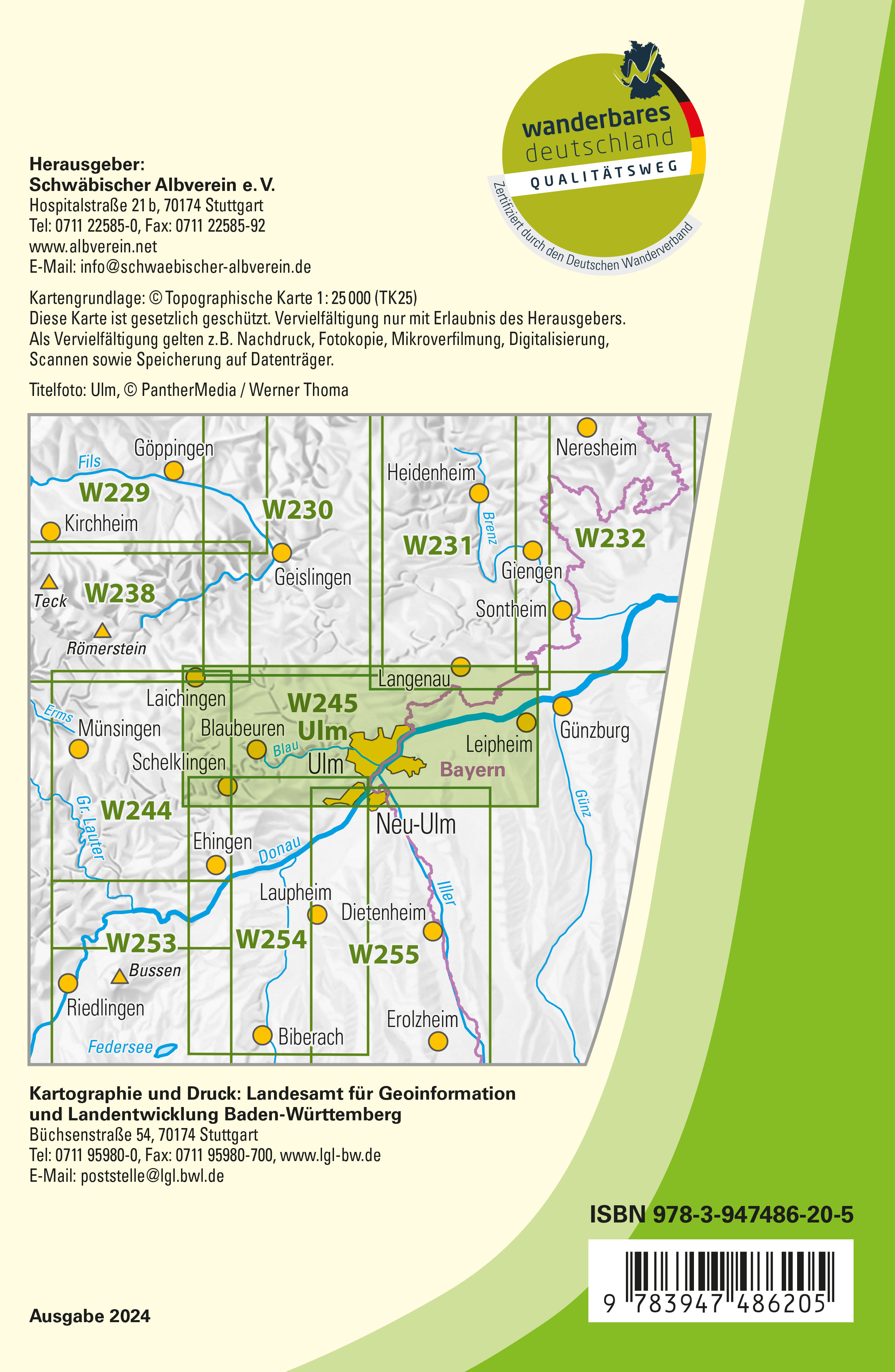 Gebiet: Laichingen, Dornstadt, Berghülen, Heroldstatt, Blaubeuren, Blaustein, Schelklingen, Bernstadt, Langenau, Beimerstetten, Elchingen, Leipheim, Nersingen, Ulm, Neu-Ulm, Holzheim, Wiblingen, Pfaffenhofen a.d. Roth.Inhalt: Im idealen Maßstab von 1:25.000 bildet die Wanderkarte die kompletten Wanderwege des Schwäbischen Albvereins mit ihren farbigen Wegzeichen ab. Dabei sind in der Karte die wichtigen überregionalen Wanderwege des Schwäbischen Albvereins, wie z.B. der Schwäbische-Alb-Südrand-Weg (HW 2), der Main-Donau-Bodensee-Weg (HW 4) und der Schwäbische-Alb-Oberschwaben-Weg (HW 7), und weitere regionale und überregionale Wanderwege mit den entsprechenden Wanderzeichen dargestellt. Teile von Jakobs-, Jakobus- und Martinusweg, die Qualitätswege Eiszeitpfad: Lauterfelsensteig, Eiszeitpfad: Blaubeurer Felsenstieg und Eiszeitpfad: Eiszeitjägerpfad sowie viele weitere Erlebniswege sind ebenfalls wiedergegeben.Das malerische Donautal und die tief eingeschnittenen Täler der Aach, der Blau und der Lauter bieten viele Möglichkeiten für kleinere und einfache, aber auch ausgedehnte und anspruchsvolle Wanderungen mit herrlichen Aussichtspunkten. Ein Ausflug an den Blautopf oder zu den zahlreichen Höhlen am Südrand der Blaubeurer Alb ist absolut lohnenswert. Schöne Ortslagen mit historischen Altstädten wie Blaubeuren, Ulm und Leipheim runden das Angebot ab.Die Karte enthält touristische Informationen wie z.B. Aussichtspunkte, Schutzhütten, Grillplätze, Sehenswürdigkeiten, Wanderheime und Gasthäuser in Auswahl. Außerdem besonders gekennzeichnete touristische Objekte und vieles mehr. Dargestellt sind auch Bahnhöfe und Haltestellen. Zur besseren Orientierung ist das UTM-Gitter in blauer Farbe wiedergegeben. Die Größe des Maßstabs ermöglicht einen detaillierten Überblick über das ausgewählte Gebiet.